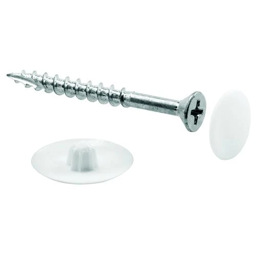 These white Phillips head screw cover caps are constructed from plastic. They feature a sure-hold friction-fit stud that allows them to easily snap into the Phillips head grooves of screw heads. Screw cover caps like these are designed to conceal visible and unsightly screw heads in finished woodwork and furnishings. Each cap features a large 1/2-inch outside diameter and a smooth finished surface.