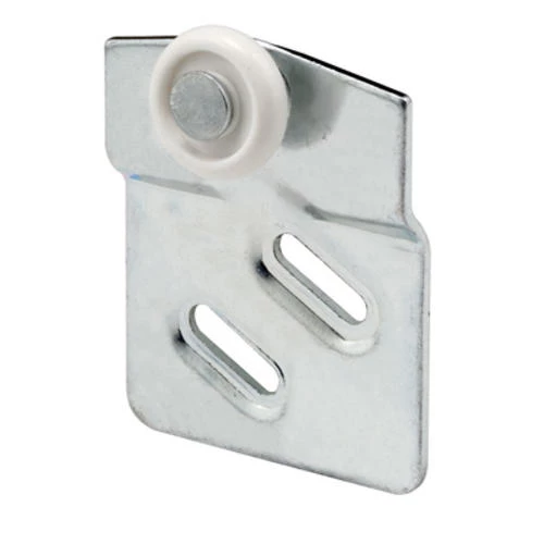 - Sliding wardrobe front door roller assembly with a 7/8″ outside diameter round edge plastic wheel on a 1/4″ offset zinc-plated steel bracket
