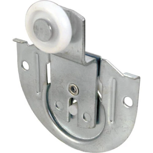 - Sliding wardrobe back door roller assembly with 7/8″ outside diameter plastic wheel on 3/8″ offset steel bracket includes a plastic adjusting wheel