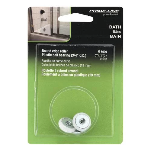 Prime-Line Products has been supplying repair and replacement parts for windows and doors since 1978. These 3/4″ tub enclosure rollers from Prime-Line are constructed from Plastic and feature an oval edge design with a threaded hex hub. The quality ball bearings and diecast zinc inner race ensure smooth and quiet operation for your sliding shower door. This package includes two rollers and comes complete with fastening bolts for quick and easy installation.